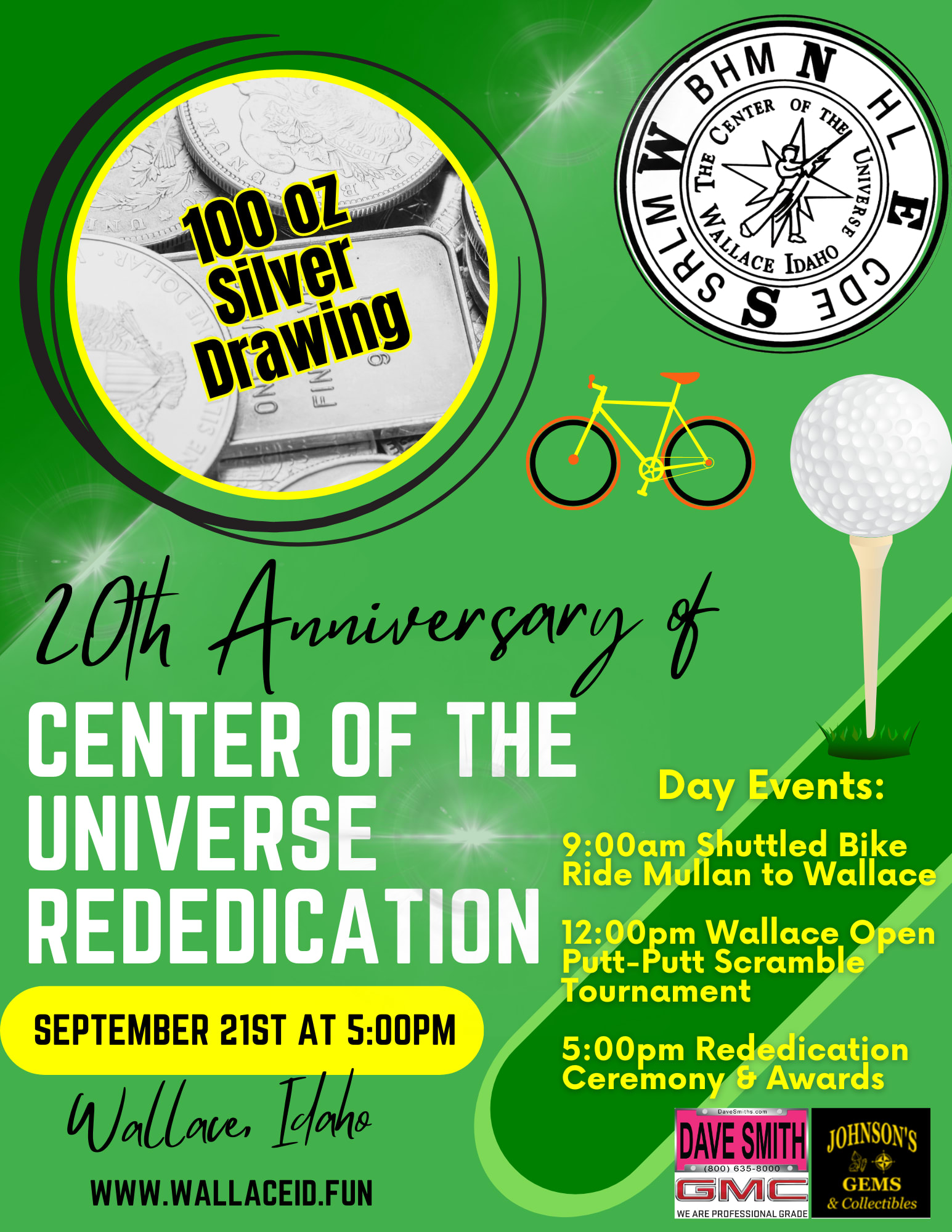 Center of the Universe 20th Anniversary Rededication Ceremony at 5:00pm we will meet at the Center of the Universe, Putt-Putt Awards, Baskets and Silver Drawing to follow. Silver Drawing Tickets will be available in early August to purchase at Johnson's Gems and other locations in Wallace.