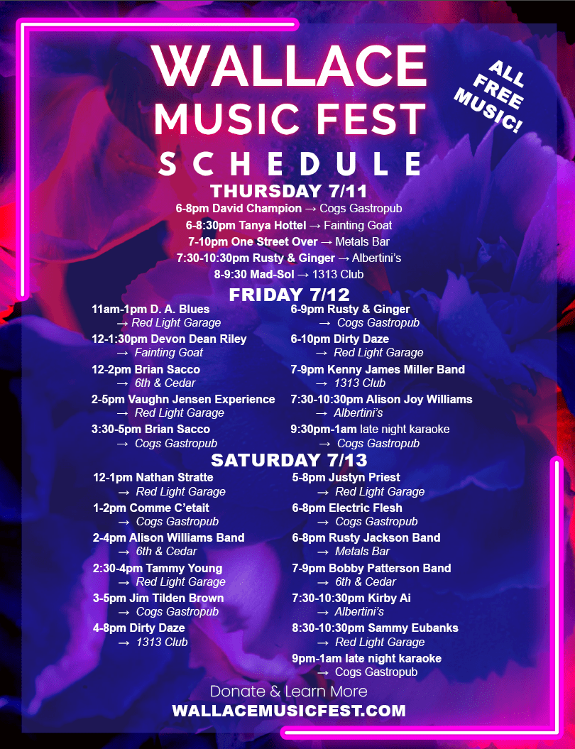In light of the cancellation from the recent canceled Blues Fest (Wallace District Arts Council) The community and business owners have stepped up to the plate to present The Wallace Music Fest. It is moving forward full steam.