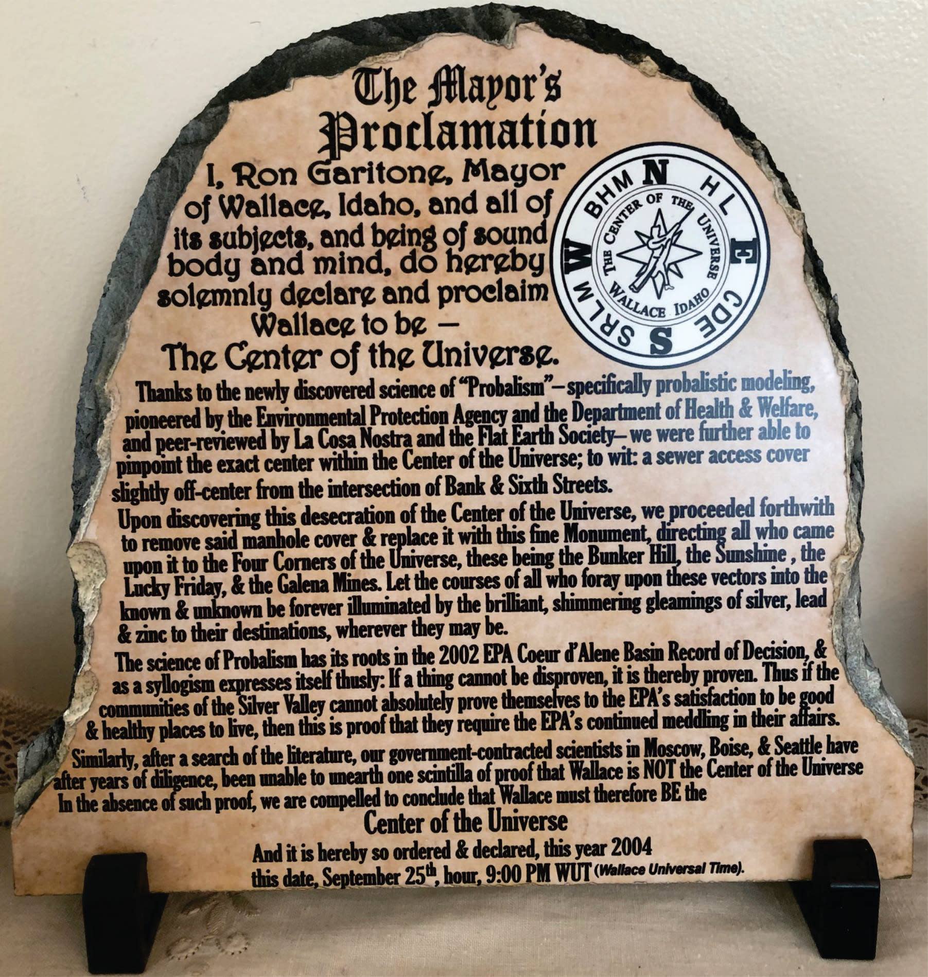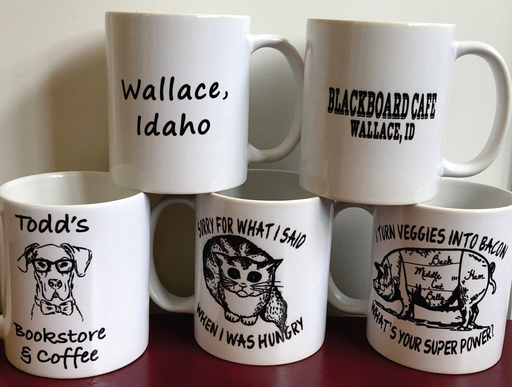 Emblazon your shirt, mugs, hats and signs with your own unique message. Specializing in Wallace themed merchandise--including the highly popular "I'm on Wallace Time" and "Center of the Universe" line of products. Featured at The Past-Present Shoppe in downtown Wallace, too.