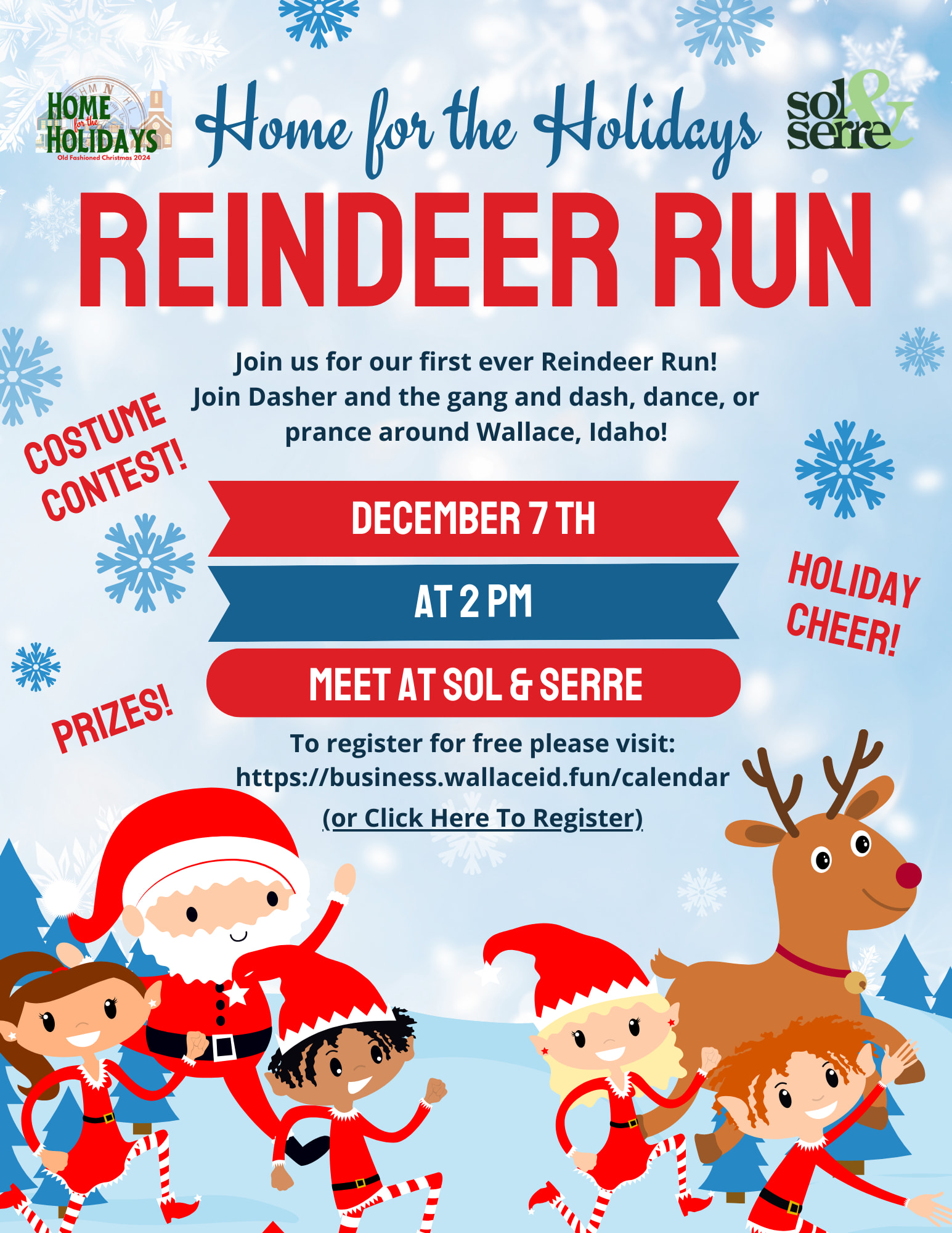 The first ever Home for the Holidays Reindeer Run will be held on December 7th at 2 pm. We will meet in front of Sol & Serre, 10 minutes prior to the start of the race. Prizes will be given to the top male and female finishers. A costume contest will also be held. Please come dressed as your favorite Christmas character or in your favorite Christmas attire. Ugly sweaters, Onesies, and face paint are encouraged! Prizes will also be awarded to the best dressed runners/walkers on the course! Light refreshments and awards will follow the conclusion of the race at Sol & Serre. Sol & Serre is located at 618 Bank St, Wallace. See you on the course!